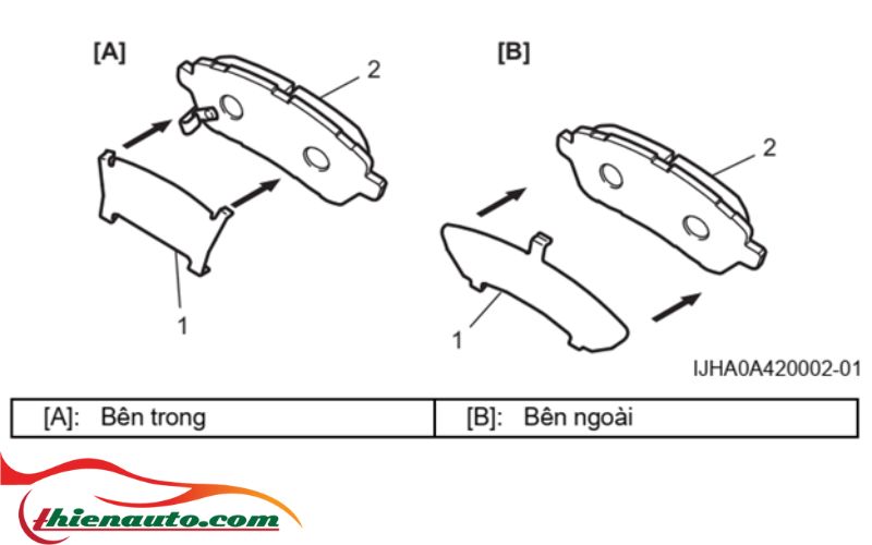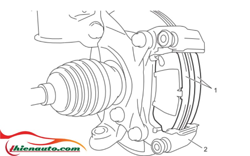 - Lắp các miếng đệm (1) vào các bố phanh trước (2).