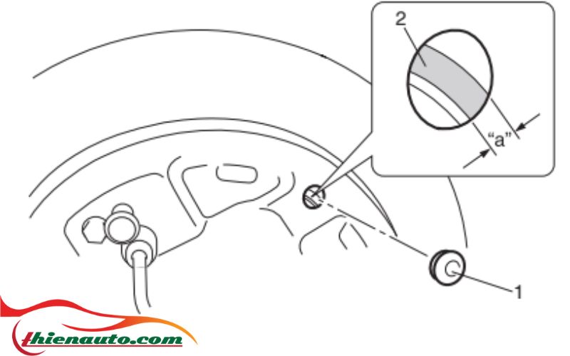3) Thông qua lỗ trên ốp sau, kiểm tra bằng mắt thường độ dày “a” của má phanh sau (2). Nếu má phanh sau bị hao mòn đáng kể, hãy kiểm tra độ dày má phanh sau như sau.