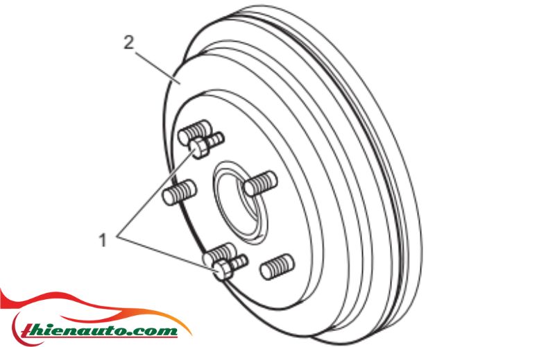 - Tháo tang trống phanh sau (2) bằng cách vặn đều các bu-lông M8 (1)