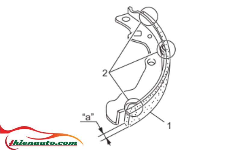 - Đo độ dày guốc phanh “a” (không bao gồm vỏ sau) tại ít nhất ba điểm (2). Nếu bất cứ giá trị đo được nào không đúng như quy định hoặc nếu phát hiện tình trạng mòn không đều rõ rệt, hãy thay thế tất cả các guốc phanh của xe.