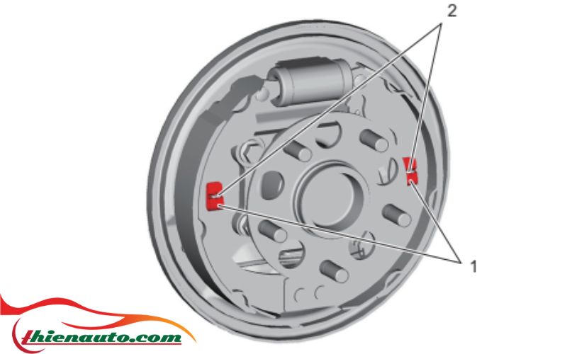 - Tháo các lò xo hãm dưới guốc phanh (1) bằng cách vặn các chốt hãm guốc phanh (2).