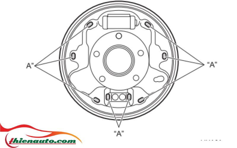 - Trước khi lắp các guốc phanh vào ốp sau tang trống phanh, hãy vệ sinh ốp sau tang trống phanh và bôi mỡ “A”. “A”: Mỡ phanh chịu nhiệt