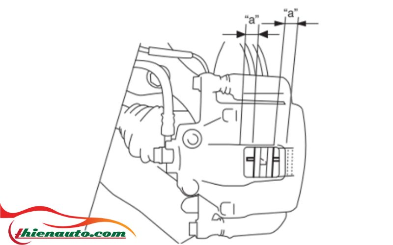 Kiểm tra má phanh trước định kỳ theo lịch bảo dưỡng và bất cứ khi nào tháo bánh xe (để kiểm tra sự đảo lốp hoặc vì nguyên nhân khác). Kiểm tra độ dày lớp lót bên trong và bên ngoài. Nếu lớp lót bị mòn và độ dày lớp lót (khoảng cách “a” trong hình) nhỏ hơn giới hạn, hãy thay đồng thời tất cả các bố phanh.