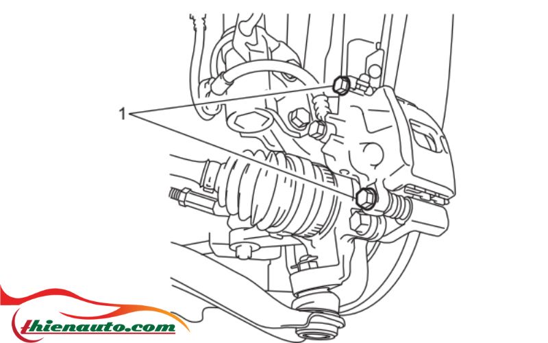 - Tháo bu-lông chốt bộ kẹp phanh trước (1).