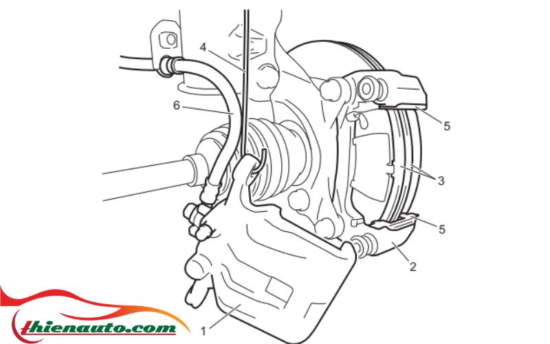 - Tháo bố phanh trước (3) và lò xo má phanh (5) khỏi giá bộ kẹp phanh trước.