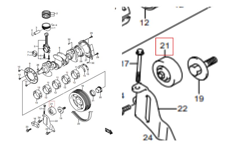 • Vị trí lắp đặt: Bi tì dây cu-roa tổng, hay còn được gọi là bi tì dây curoa chính, là một phụ tùng quan trọng của hệ thống cụm tăng tổng trên xe ô tô Suzuki Ertiga 2018. Được biết đến như một phần không thể thiếu trong hệ thống khác của xe này.